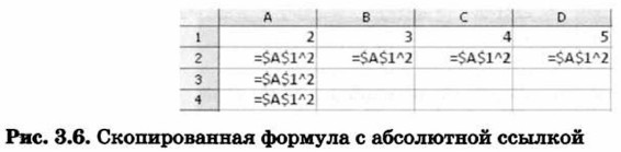Ежегодный расчёт численности населения мы (согласно условию задачи) осуществляли по одной и той же формуле, исходные данные для которой всегда находились в ячейке, расположенной в том же столбце, но на одну строку выше, чем расчётная формула. При копировании формулы, содержащей относительные ссылки, нужные нам изменения осуществлялись автоматически. Абсолютные ссылки. Абсолютная ссылка в формуле всегда ссылается на ячейку, расположенную в определённом (фиксированном) месте. В абсолютной ссылке перед каждой буквой и цифрой помещается знак $, например $А$1. При изменении позиции ячейки, содержащей формулу, абсолютная ссылка не изменяется. При копировании формулы вдоль строк и вдоль столбцов абсолютная ссылка не корректируется (рис. 3.6).