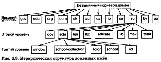 § 4.2. Всемирная компьютерная сеть Интернет Доменная система имёнНаряду с цифровыми IP-адресами в Интернете действует более удобная и понятная для пользователей доменная система имён (DNS — Domain Name System), благодаря которой компьютеры получают уникальные символьные адреса. Доменная система имеет иерархическую структуру: домены верхнего уровня, домены второго уровня и т. д. (рис. 4.3).