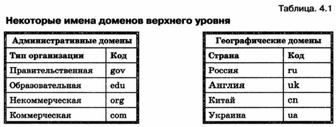 Домены первого уровня бывают двух видов: административные (трёхбуквенный код для организаций определённого типа) и географические (двухбуквенный код для каждой страны) (табл. 4.1).