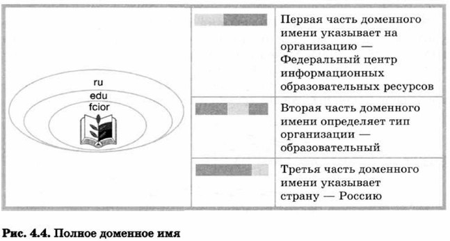 Полное доменное имя состоит из непосредственного имени домена и далее имён всех доменов, в которые он входит, разделённых точками. Пример. Полное имя fcior.edu.ru обозначает домен третьего уровня fcior, входящий в домен второго уровня edu, принадлежащий домену верхнего уровня ru (рис. 4.4).