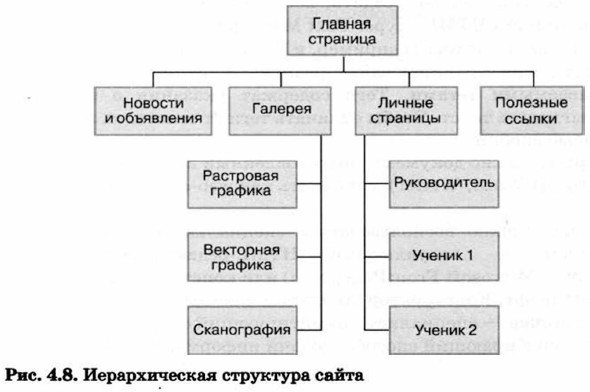 § 4.4. Создание web-сайта Содержание и структура сайтаНезависимо от того, каким инструментарием вы будете пользоваться для создания сайта, первоначально следует продумать его содержание и структуру. Предположим, вы посещаете кружок компьютерной графики и решили создать сайт этого творческого объединения. Содержание сайта должно быть таким, чтобы отражать творческую жизнь участников объединения, привлекать внимание единомышленников. Теперь необходимо определить структуру (план) сайта — разбиение общего содержания на смысловые разделы и отдельные страницы с указанием связей между ними. Очевидно, сайт может включать в себя общую информацию (программу и расписание занятий, место проведения занятий, фамилию, имя, отчество руководителя и т. д.), страницу новостей и объявлений, личные страницы руководителя и участников объединения, галерею работ участников объединения, полезные ссылки на другие ресурсы сети Интернет и многое другое. Изобразим структуру сайта в виде графа (рис. 4.8).