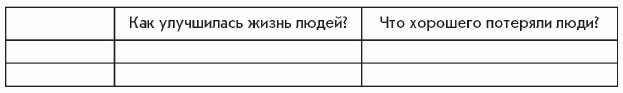 Признаки успешного выполнения задания Необходимый уровень (хорошо): заполнено не менее трёх строк левой колонки (Как улучшилась жизнь людей?). Повышенный уровень (отлично): заполнено не менее трёх строк левой колонки и не менее двух строк правой колонки (Что хорошего потеряли люди?). Проверь себя по словарю, учебнику или с помощью учителя. Если возникают затруднения, то вместо ответа напиши, каких умений и знаний тебе не хватает.