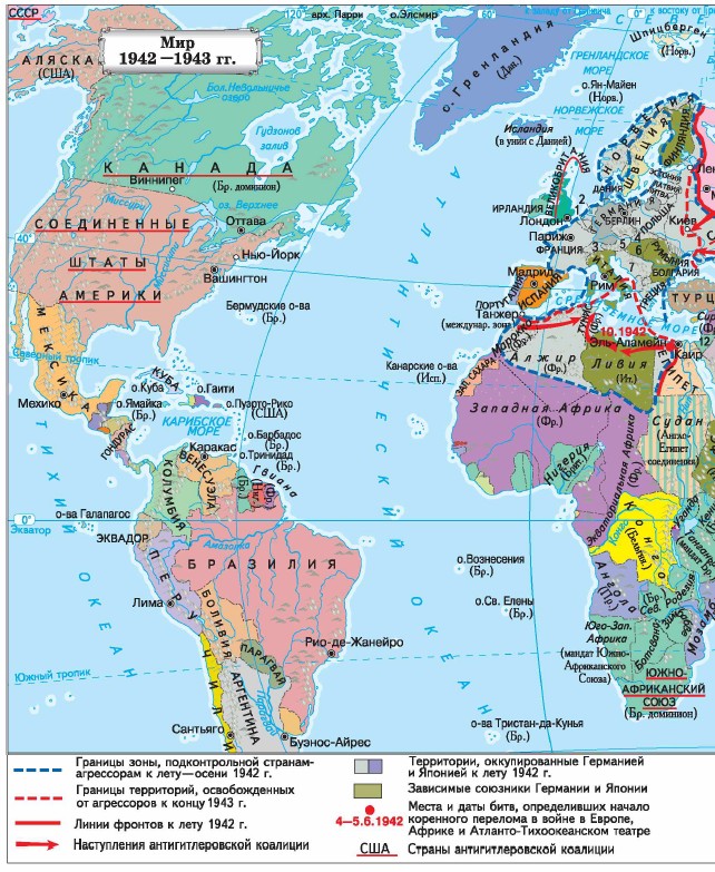 Глава 3. Пожар Второй мировой войны (1939—1945 гг.) § 8—9. Победа над фашизмом (продолжение)Еще раньше, в июне 1942 года, на Тихом океане в битве у атолла Ми́дуэй сошлись авианосные соединения флотов Японии и США. Японцы, имевшие целью захватить Алеутские острова, намеревались предварительно уничтожить американские самолеты, базирующиеся у атолла Мидуэй. Американцам удалось расшифровать радиосообщения японцев и скрытно подвести к атоллу свою эскадру. В бою американцы потопили все 4 японских авианосца, уничтожили 261 самолет, потеряв при этом 1 американский авианосец и 147 самолетов. Военно-морской флот Японии утратил свое превосходство в центральной части Тихого океана.