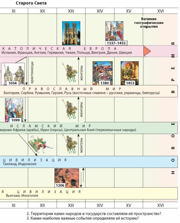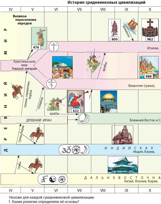 Древнейшие цивилизации возникли на Востоке (за пределами Европы): Древний Египет, Древнее Междуречье и мир Западной Азии, Древняя Индия, Древний Китай. Каждая из них обогатила современное человечество своими достижениями, среди которых наиболее известны: иудейская Библия (Ветхий Завет), философско-религиозные учения — буддизм и индуизм, конфуцианство и даосизм. Чуть позже возникли цивилизации Запада (в пределах Европы): Древняя Греция и Древний Рим, которые создали античную философию, литературу, искусство. Объединить Древний Восток и античный Запад попытались римляне. К началу новой эры они покорили все античные и восточные общества по берегам Средиземного моря, создали Римскую империю, в пределах которой сложилась античная греко-римская цивилизация. В западных областях этой империи разноплемённые жители переняли латинский язык и культуру, в восточных — сохранился греческий язык и языки народов Востока. Именно здесь зародилась новая религия - христианство, появилась вторая часть Библии — Новый Завет. Когда христианство распространилось среди жителей Римской империи, император Константин фактически объявил её в 313 году государственной религией. Все общины верующих составили единую Христианскую Церковь, которой управляли выбранные епископы. На их соборах были утверждены Символ веры (краткое изложение вероучения) и тексты книг Нового Завета. Так античная греко-римская цивилизация преобразовалась в христианский мир. Великое переселение народов Азии и Европы отделило Древний мир от эпохи Средних веков (V—XV вв.). Под натиском скотоводов-кочевников Великой Степи пала сначала Китайская империя Хань, а потом поток переселяющихся племён докатился до Европы. В V веке германские и другие варварские племена сокрушили Западную Римскую империю и создали в разных её частях королевства. Постепенно христианская церковь раскалывается на католическую и православную, а единый христианский мир — на две цивилизации. В католической Западной Европе различные народы и королевства объединяла единая Католическая церковь во главе с Папой Римским. В православном мире Балкан и Восточной Европы главным объединителем народов считалась Восточная Римская империя, вошедшая в историю под именем Византии. Её жители считали свою столицу Константинополь Вторым Римом — хранителем истинного христианства. На Востоке в VII веке пророк Мухаммед стал основателем исламской религии. Его преемники подчинили Арабскому халифату многие земли и народы. На просторах Ближнего и Среднего Востока сложилась единая исламская цивилизация. Воины ислама попытались покорить также и Индию, но, несмотря на их вторжения, здесь сформировалась самостоятельная индийская цивилизация. Её особенностью было соперничество сразу трёх религий: индуизма, буддизма и ислама. На Дальнем Востоке — вокруг средневекового Китая — сложилась дальневосточная цивилизация. Её народы и государства объединяло переплетение трёх религиозных учений: буддизма, конфуцианства и даосизма.