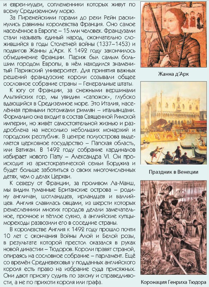 Введение 2 Европа на пороге Нового времени (продолжение)Однако не все соблюдали церковные правила. В (Почему? Кто?) На проповедях священники призывали к смирению, отказу от стремления к богатству. Однако сами строго собирали церковную десятину даже с голодающих бедняков. П Место аббата или епископа давало возможность распоряжаться огромными доходами церкви, поэтому многие аристократы, не стесняясь, покупали эти должности у церковного начальства. Они выстраивали себе роскошные дворцы, где после проповеди о скромности и чистоте предавались пьяным пирам и разгульному веселью. П По учению Католической церкви, добрые дела одних людей могут искупать грехи других. В (Как?) Заплатив несколько золотых монет чиновнику Папы Римского, можно было получить специальную грамоту — индульгенцию о прощении убийства, воровства и других преступлений. П В (К чему это приведёт?) Повсюду, особенно в городах, возникали учения, призывавшие к реформе (изменению) Церкви. П Вольнодумцев и еретиков не пугало даже сожжение на костре по приговору суда церковной инквизиции. В городских университетах развивалась светская наука, которая познавала мир не с помощью религиозной веры, а путём наблюдения и экспериментов. П Увеличивавшийся спрос на научные книги привёл к тому, что в 1450-х годах монах Иоганн Гутенберг изобрёл книгопечатание. В итальянских городах появились философы-гуманисты, которые объявляли человека совершенным созданием, отказывались противопоставлять душу и тело, объявляя их одинаково прекрасными. П Поэты и художники обратились к забытому наследию античной цивилизации. Так возникло искусство итальянского Возрождения, которое воспевало радость жизни. П