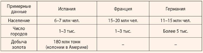 В 1580 году в Португалии прервалась местная династия, и испанский король объединил под своей властью весь Пиренейский полуостров, а также огромные колониальные владения в Америке, Африке, Азии и Океании. Это единство сохранялось свыше 60 лет. Всё это время люди говорили, что «во владениях испанского короля никогда не заходит солнце». Поток золота, хлынувший из американских колоний, привёл к тому, что в Испании раньше, чем в остальной Европе, обесценились деньги и начался стремительный рост цен. Разорявшиеся крестьяне устремились в города, где они пытались найти работу на строившихся мануфактурах. Испанские города быстро росли, во многих из них проживало уже от 10 до 40 тысяч человек. Однако труднопроходимые горные хребты и таможни на границах между разными частями королевства препятствовали формированию единого рынка. В то же время Филипп II тратил доходы казны на выплату денежной помощи католикам в других странах. Все учёные, студенты, книгопечатники, которые подозревались в хранении книг, запрещённых Тридентским собором, или в сочувствии идеям Лютера или Коперника, оказывались в пыточных подвалах испанской инквизиции. Так же беспощадно сжигали на кострах «врагов христианства» — арабов-мусульман и евреев-иудеев, среди которых было много купцов, банкиров, мануфактуристов, талантливых ремесленников и учёных. Пытаясь спасти свою жизнь и сохранить веру, они бежали из Испании. В результате таких действий властей некоторые густонаселённые и цветущие области внутри Испании совершенно обезлюдели. Поражение в войне с Нидерландами и Англией в конце XVI века подорвало могущество Испании в Европе и колониях. В таких условиях испанская промышленность и торговля не могли больше конкурировать с быстро развивавшейся промышленностью Англии и Голландии. В течение XVII века рост населения замедлился, причём 90% его занималось сельским хозяйством. Португалия освободилась от власти Испании, на престол там взошла новая династия. В Испании разрушение аграрного общества замедлилось. Франция: от религиозных войн к абсолютизму
