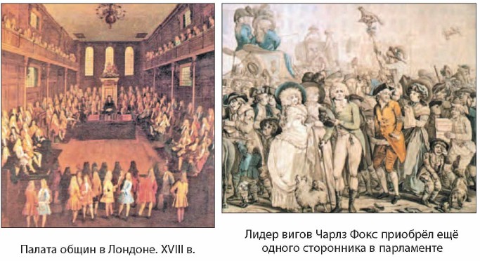 Карл II недолго был верен подписанному соглашению. Уже на второй год его правления, в годовщину казни Карла I, могила Кромвеля была вскрыта, а труп его повешен и затем обезглавлен. Была восстановлена Англиканская церковь, начались преследования пресвитерианских священников. Часть земель возвратили прежним владельцам. В парламенте сложилась организованная группа противников короля, которых называли «виги» (от шотландского слова виггаморы — «пресвитериане»). Сторонники короля в парламенте получили название тори — именно так в старину называли ирландских католиков. Наследником бездетного Карла II стал его брат Яков II (1685—1688). Он был католиком и всячески покровительствовал своим единоверцам, назначая их на государственные и церковные должности. После отказа парламента отменить ограничения для католиков Яков II распустил парламент, вызвав недовольство даже у защищавших династию тори. Объединившись с вигами, они тайно пригласили на английский престол штатгальтера Голландии Вильгельма Оранского, женатого на дочери Якова II Марии. Когда в 1688 году Вильгельм с небольшим военным отрядом высадился в Англии, армия отказалась защищать Якова II, и тот вынужден был бежать во Францию. Приветствуемый народом Вильгельм III (1688-1702) вступил в Лондон. Поскольку эти события носили мирный характер, передача власти в руки парламента получила название Славной революции. Новый король и его преемники могли управлять Англией только в согласии с парламентом. Это означало, что в стране утвердилась новая форма правления — ограниченная законом конституционная монархия. При этом единой конституции в Англии так и не было создано. Её заменяли несколько законов, изданных в разное время. В 1689 году парламент принял «Билль (закон) о правах». Согласно ему налоги и законы мог устанавливать только парламент. Он должен был собираться постоянно, его избирали на свободных выборах подданные, обладавшие собственностью. При этом каждый из них получал свободу слова — право свободно высказываться и доказывать свою точку зрения на собраниях, в газетах, в парламенте. Тори и виги превратились в политические партии, то есть организации, которые выражали мнения разных слоёв населения и боролись за их голоса перед каждыми новыми выборами. Кроме того, «Билль о правах» объявил выборные суды присяжных независимыми от короля.