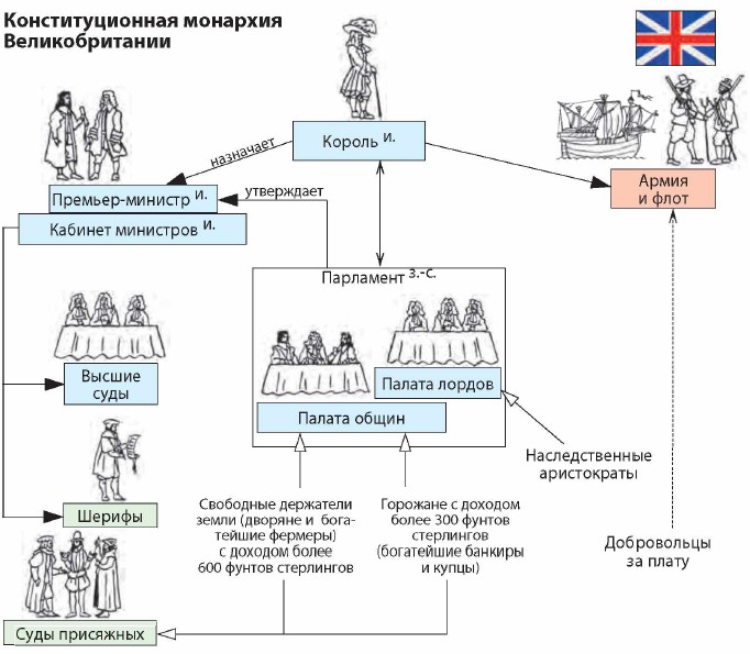 В 1701 году парламент принял «Акт об устроении». Король отныне должен был повиноваться законам Англии: исповедовать только англиканство, не иметь собственности за пределами страны и не покидать её без разрешения парламента. Кроме того, все министры «правительства его величества» могли быть вызваны в суд парламента и отправлены в отставку. Чтобы министры пользовались поддержкой парламента, король стал назначать их только из той партии (тори или виги), которая получила большинство мест на последних выборах. Так возникло правительство, по сути, назначаемое парламентом. После смерти Вильгельма III Оранского на престол взошла вторая дочь Якова II Стюарта - Анна (1702—1714). При ней в 1707 году было завершено образование объединённого королевства Англии, Шотландии, Уэльса и Ирландии. Страна получила название Великобритания. После смерти Анны парламент пригласил в Англию внука сестры Карла I — немецкого принца из протестантской Ганноверской династии — Георга I. Поскольку этот король даже не знал английского языка, при нём установился ещё один конституционный обычай. Король больше не присутствовал на заседаниях Кабинета министров, и роль главы правительства стал исполнять первый министр, назначенный парламентом. Таким образом, король был полностью устранён от государственной власти, он «царствовал, но не правил». Формулирование вывода и сравнение его с авторским