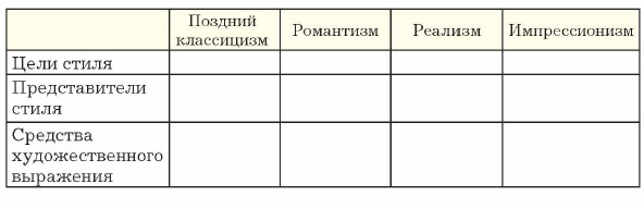 Ключевые слова: классицизм, романтизм, реализм, импрессионизм. Применение знаний