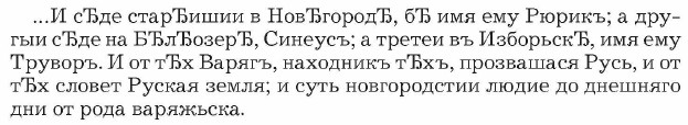 Повесть временных летОб источнике. Составлена на рубеже XI-XII вв. монахом КиевоПечерского монастыря Нестором, который использовал начальные русские летописи, устные предания и легенды, народные песни, жития святых, тексты княжеских договоров и других документов, позднее утраченных. Некоторые события, одновременно упоминаемые в европейских и византийских источниках, в «Повести временных лет» датированы ошибочно. Самый древний сохранившийся список - Лаврентьевская летопись 1377 г. Фрагмент «Повести временных лет» о призвании варягов в переводе академика Д.С. Лихачёва: ...И пошли за море к варягам, к руси. Те варяги назывались русью, как другие называются шведы, а иные норманны и англы, а ещё иные готландцы, — вот так и эти. Сказали руси чудь, словене, кривичи и весь: «Земля наша велика и обильна, а порядка в ней нет. Приходите княжить и владеть нами». И избрались трое братьев со своими родами, и взяли с собой всю русь, и пришли, и сел старший, Рюрик, в Новгороде, а другой, Синеус, - на Белоозере, а третий, Трувор, - в Изборске. И от тех варягов прозвалась Русская земля. Новгородцы же - те люди от варяжского рода, а прежде были словене... Новгородская первая летопись младшего изводаОб источнике. Самый ранний памятник новгородского летописания. Описывая события, отстоящие от них на 200 лет, новгородские летописцы использовали сохранившиеся на Севере устные предания, возможно, какие-то письменные документы. Их информация частично отличается от «Повести временных лет». Самый ранний из сохранившихся списков летописи, относящийся к событиям IX-X вв., был переписан на бумаге в 1441 г.