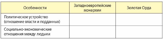 Вспомните понятия: восточная деспотия, сословно-представительная монархия (словарь). Составьте список ключевых событий, определявших характер отношений Руси и Орды с середины XIII до середины XV в. (хронологии § 22-24). Заполните сравнительную таблицу (§ 20-21, 24).