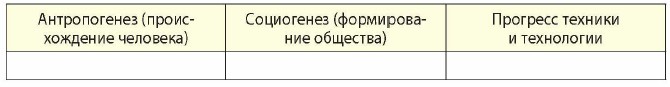40 млн л.н. - в тропических лесах появляются «древесные обезьяны» - общие предки современных людей и человекообразных обезьян. 5 млн л.н. - в африканских сухих степях появляются прямоходящие обезьяноподобные предки людей - австралопитеки. Более 2 млн л.н. - часть австралопитеков изменяется, и появляется первый вид людей - «Человек умелый». Группы этих обезьяноподобных людей занимались охотой, собирательством, изготавливали простейшие деревянные и каменные орудия. 1,5 млн л.н. - появляется новый вид - «древнейшие люди». Они расселяются из Африки в Азию и Европу, используют огонь. 300 тыс. л.н. (по другим датировкам - 150 тыс. л.н.) - появляется и расселяется по планете новый вид - «древние люди», неандертальцы. Они стали изготавливать каменные топоры, меховую одежду; они совершали первые захоронения - у них зародилась простейшая религия. 100 тыс. л.н. (по самым ранним датировкам) - появляется вид современных людей - «человек разумный». Люди нового вида начинают заселять всю планету. 40 тыс. л.н. - родовые общины «человека разумного» расселяются по Азии и Европе (первые археологические находки). 35 тыс. л.н. - первые наскальные рисунки - первобытное искусство. 12 тыс. л.н. - изобретение лука и стрел, приручение собаки. 10 тыс. л.н. (VIII тыс. до н.э.) - появление первых земледельцев (выращивали пшеницу, ячмень) и скотоводов (разводили коз, овец), изобретение ткачества и глиноделия. 9-8 тыс. л.н. - растущие племена земледельцев-скотоводов расселяются из Западной Азии. Образование языковых семей. 7 тыс. л.н. - начало металлообработки в Западной Азии - каменный век сменяется медным и бронзовым. Изобретение плуга, появление соседских общин, начало войн за добычу, усиление власти вождей, расслоение общин. 6-5 тыс. л.н. - в Западной Азии разделение земледельческих и пастушеских племён - изобретение колеса, появление орошаемого земледелия. Ок. 5 тыс. л.н. - возникновение первых городов, государств - переход от первобытного общества к ступени цивилизации.