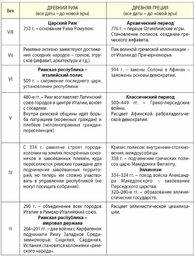 Вместо театров римляне строили цирки — круглые арены, на которых заставляли военнопленных сражаться, убивая друг друга во славу римского бога войны — Марса. Римлян меньше интересовали философия и искусство и больше — точность в законах. Они создали знаменитое римское право, где каждая общественная ситуация была прописана в чётких терминах и нормах. Благодаря своей военной экспансии Рим быстро перерос границы обычного полиса, став крупной мировой державой. К концу I в. до н.э. он охватил всё Средиземноморье, поглотив эллинистические монархии. Развитие Рима: от гражданской общины к мировой империи(в сравнении с Грецией)