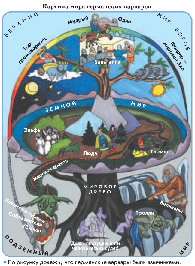 За линиями римских укреплений по Рейну и Дунаю обитали разные варварские племена, в основном германцы. В отличие от римлян они жили не в каменных отдельных домах, а в длинных деревянных срубах, где умещалось несколько семей одного рода. Вместо пышного пшеничного хлеба и сладкого виноградного вина германцы ели серые ячменные лепёшки и пили пиво. Одевались они не в тонкие изящные туники, а в грубые штаны и рубахи. Германцы верили, что на деревьях обитают волшебные существа эльфы, в подземельях — кузнецы-колдуны гномы, в горах — злые великаны и тролли, а по небу разъезжают боги — громовержец Тор и мудрый воитель О́дин, готовящийся сразиться с предводителем зла — волком Фенри́ром. Вожди германских племён (герцоги, ко́нунги, фю́рсты) в борьбе с римлянами создавали союзы. После удачных походов на совместных пирах воины- дружинники и ополченцы-общинники делили добычу. В первые века Новой эры первобытные племена, жившие вдоль «пояса» древних цивилизаций, пришли в движение. В Европе стало холодно и дождливо, сокращение урожаев вынудило первобытных земледельцев двинуться на юг. В азиатских степях, напротив, стало выпадать меньше дождей, и кочевые племена вступили в жестокую борьбу за сокращающиеся пастбища. Окрепшие в этой борьбе союзы племён прорвались за Великую Китайскую стену, и в Китае в IV веке началась смутная эпоха «шестнадцати царств семи северных племён». Другой союз кочевых племён — гу́нны — двинулся за Алтайские горы в Великую степь, покоряя и увлекая за собой здешних кочевников. Часть кочевых вождей повели своих воинов на юг — они покорили государства Средней Азии, разгромили войска Ирана, захватили и опустошили Северную Индию. Большинство же племён во главе с гуннами двигались на запад — в Европу. В 375 году они разгромили германцев-готов, живших в Причерноморье, и обосновались рядом с римской границей. Новые соседи казались римлянам чудовищными «двуногими зверями на безобразных лошадях». Спасаясь от гуннов, готы с жёнами и детьми стали переселяться на римские земли. Борьба с варварами стала одной из главных причин, по которой в 395 году император Феодосий разделил империю между своими сыновьями на Западную Римскую и Восточную Римскую.