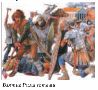 Чтобы защитить Италию от готов, западноримский император отозвал войска из Британии и Галлии. В итоге племена вандалов и алан прорвались через Рейн в Галлию, превратив её в «дымящийся огромный погребальный костёр». В 410 году западные готы ворвались в Рим, оставленный императором. Вечный город горел, под триумфальными арками проезжали варварские вожди. Христианский писатель Иерони́м, переведший Библию на латинский язык, так написал об этом: «Когда погас ярчайший свет, когда весь мир погиб в одном городе, тогда я онемел». Вскоре, в 410-450-х годах, вожди готов, вандалов, бургундов, англов захватили целые провинции в Галлии, Африке, Британии. Они размещали своих воинов с семьями на лучших землях, объявляли себя повелителями местных римских граждан. Эти государственные образования принято называть варварскими королевствами.