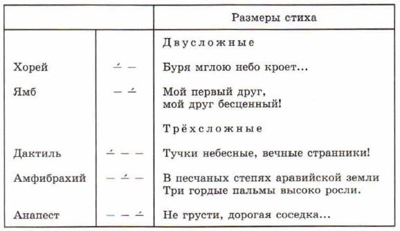 1. Запомните названия стихотворных размеров и их схемы. Рассмотрите таблицу. Назовите авторов приведённых строк.