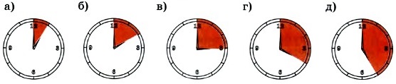 Часть 3. Урок 1 Сравнение углов1. Определи по рисункам время, которое показывают часы. Обозначь дугой на каждом рисунке выделенный цветом угол, образованный стрелками часов. Что общего и что различного у всех этих углов? Какой из них самый маленький, а какой — самый большой?