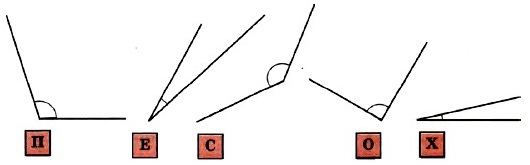 б) Начерти на листе бумаги угол. Построй на глаз его биссектрису. Проверь правильность построения перегибанием листа. 7. а) Вырежь из листа бумаги треугольник. Построй перегибанием биссектрисы его углов. б) Вырежь из листа бумаги прямоугольник. Построй перегибанием листа биссектрисы его углов. Какие закономерности ты наблюдаешь? 8. Сравни на глаз углы. Расположи соответствующие буквы в порядке возрастания величин углов, и ты узнаешь имя знаменитого правителя Древнего Египта, для которого была построена самая большая пирамида.