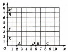 5. Построй точки: С (1; 0), Т (0; 5), К (0; 2), М (4; 0), D (7; 0), F (0; 8). 6. Какой координатной оси (Ох или Оу) принадлежат точки: N (18; 0) ∈______ Р (0; 16) ∈______