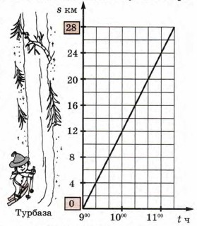 5. На рисунке изображен график движения лыжника. Используя этот график, ответь на вопросы: 1) В котором часу лыжник вышел с турбазы? 2) Сколько времени он был в пути? 3) Сколько километров он прошел за это время? 4) Менялась ли в пути скорость его движения? 5) С какой скоростью он шел? 6) Делал ли он в пути остановки? 7) На каком расстоянии от турбазы был лыжник в 9 ч 40 мин? В 10 ч 20 мин? В 11 ч? 8) В котором часу он находился на расстоянии 4 км от турбазы? 12 км? 20 км? Запиши формулу зависимости расстояния S от времени движения t. 6. Автомобиль, двигаясь равномерно со скоростью 80 км/ч, проехал 240 км. Построй график его движения (1 кл. — 7. Найди корни уравнений и сделай проверку: