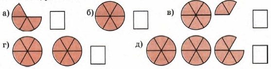 Что необычного в полученных дробях? Можно ли и в этом случае понимать черту дроби как знак деления? б) Закрась на рисунке 5 четвертых долей круга цветным карандашом. Какой дробью можно выразить закрашенную часть? Запиши: 2. Запиши дроби, выражающие количество шестых долей круга на каждом из рисунков а—д. Какие из полученных дробей больше 1, меньше 1, равны 1?