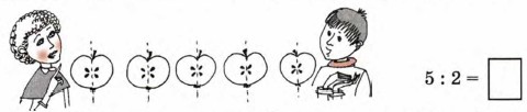3. Как разделить 5 яблок поровну между 2 детьми? Сколько половинок достанется каждому? Раскрась их разными цветами и запиши ответ.