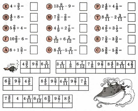 б) Составь примеры на разные случаи сложения и вычитания смешанных чисел и зашифруй название какого-нибудь морского жителя. 3. Реши уравнения: