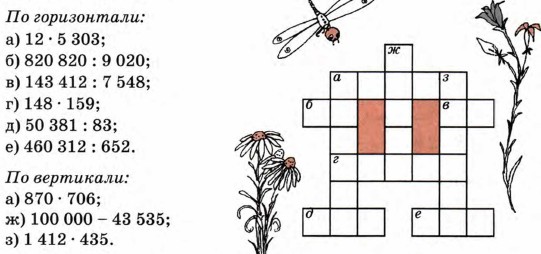12. Запиши на математическом языке: а) шестая часть от числа а; б) двенадцатая часть от суммы чисел b и c; в) восьмая часть от разности чисел x и у; г) сороковая часть от произведения чисел р и k. 13. Чему равно число, если: а) его четвертая часть равна d; б) его двадцать девятая часть равна m + n; в) его 1% равен а - c; г) его сто двадцатая часть равна b : t? 14. Реши уравнения: а) (30 • X - 560): 8 = 80; б) 630 : (30 - у) - 45 = 25. 15. Числовой кроссворд.