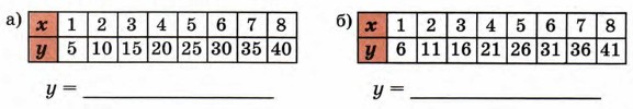 16. Продолжи ряд на 4 числа, сохраняя закономерность: а) 4, 5, 15, 16, 26, 27, ... б) 1, 2, 4, 7, 11, 16, ... 17*. Найди по таблице зависимость между переменными x и у. Запиши эту зависимость в виде формулы.