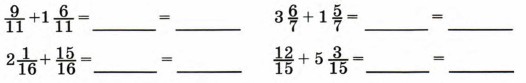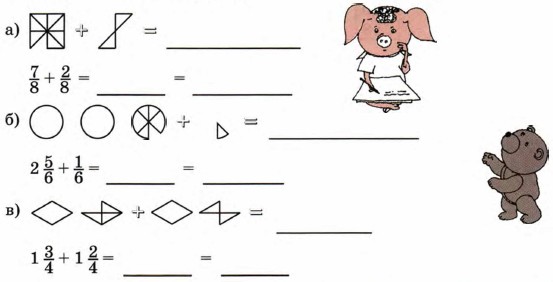 Часть 2 Сложение и вычитание смешанных чисел. Урок 121. Выполни действия с фигурами и допиши равенства. В чем особенность приведенных примеров?