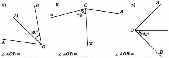 Какие из лучей на рисунке являются биссектрисами углов? 6. Найди величину угла АОВ, если ОМ — его биссектриса. Определи вид угла АОВ (острый, прямой, тупой, развернутый).