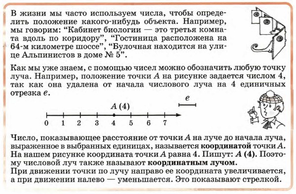 б) Муравей вышел из точки Б (4) координатного луча, сделал два перемещения по лучу и оказался в точке С (7). Какие это могли быть перемещения? 7. Автомобиль проехал из некоторой точки А координатного луча 6 единиц вправо и оказался в точке B (17). Из какой точки он выехал? Как он должен был перемещаться, чтобы попасть из точки А в точку С (8)? 8. На сколько единиц и в какую сторону надо сместиться, чтобы из точки М (16) попасть в точку с координатой: а) 14; б) 22; в) 12; г) 6; д) 21; е) 0; ж) 16?