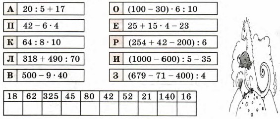 12. Миша, Сережа и Андрей лепили солдатиков. Миша сделал 12 солдатиков, а Сережа — на 4 солдатика больше. Вместе Миша и Сережа сделали в 2 раза больше солдатиков, чем Андрей. Сколько солдатиков сделали Миша, Сережа и Андрей вместе? Какую часть всех солдатиков составляют Мишины солдатики? 13. Викторина “В мире животных”. В мезозойскую эру, десятки миллионов лет тому назад, на Земле жили динозавры. Они были и небольших размеров, с курицу или кошку, и гигантские — до 30-50 м длины и 50 т веса. Двуногие и четвероногие, хищные и травоядные — виды их были самыми разнообразными. В конце мезозоя большинство их вымерло. На Земле осталась лишь ничтожная часть пресмыкающихся той эпохи: ящерицы и змеи, крокодилы и черепахи. Расшифруй название одного из видов динозавров.