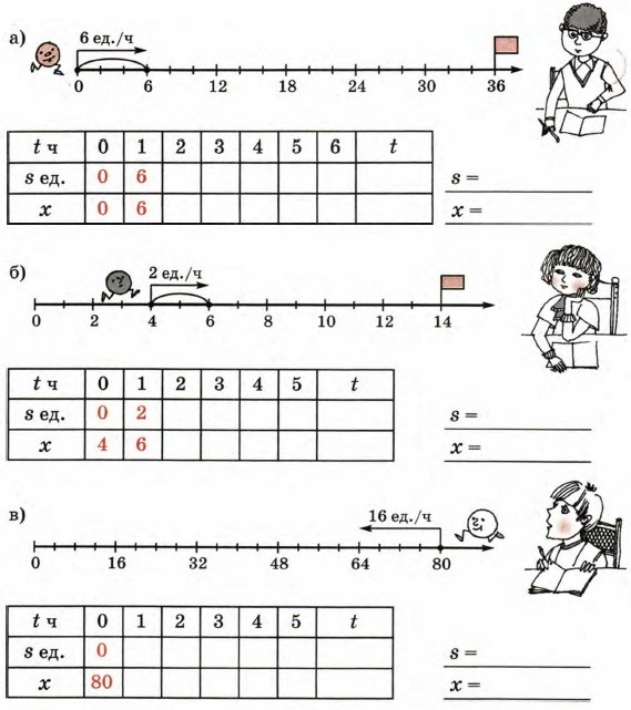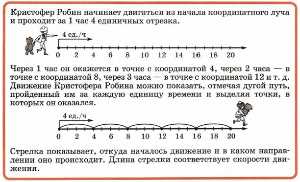 3. Как узнать, где окажется точка в момент времени t, если она вышла из точки А (6) и движется по координатному лучу направо со скоростью 2 ед./ч? Реши ту же задачу, если точка движется налево. 4. а) Движение точки В по координатному лучу описывается формулой х = 4 + 3 • t (время t — в часах). Из какой точки луча началось движение? В каком направлении и с какой скоростью оно происходило? б) Движение точки С по координатному лучу описывается формулой x = 21 - 7 • t (время t — в минутах). Определи положение точки С в начальный момент, скорость и направление ее движения. Где она оказалась через 1 мин после выхода, через 2 мин, через 3 мин?