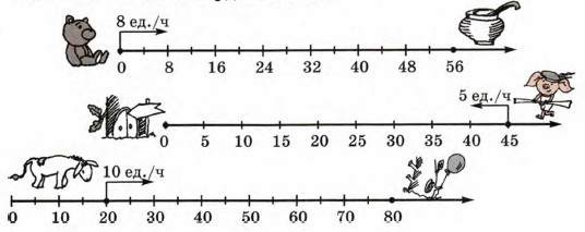 1. Определи по рисунку, откуда вышли Винни-Пух, Пятачок, Иа-Иа? Куда и с какой скоростью они идут? Покажи их движение на координатном луче и ответь на вопросы: а) За сколько времени они пройдут весь свой путь? б) В какой точке они окажутся через 3 ч после выхода? в) Через сколько времени после начала движения каждый из них окажется в точке с координатой 40?