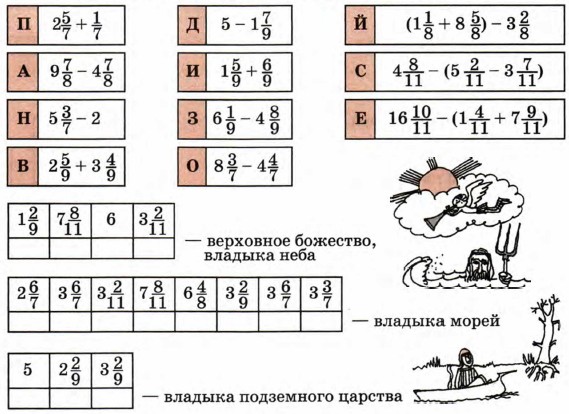 7. Назови имена трех главных олимпийских богов в греческой мифологии. Три брата, дети Кроноса и Реи, они поделили власть между собой: небо, море, подземное царство. Проверь свой ответ, выполнив вычисления. Если ты не знаешь их имен, то расшифруй их.