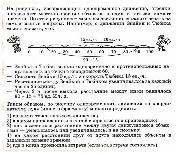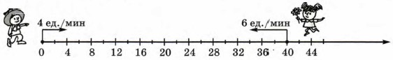 Часть 2. Урок 23 Одновременное движение по числовому лучу1. Незнайка и Кнопочка вышли одновременно навстречу друг другу из точек 0 и 40 координатного луча. Определи по рисунку скорость и направление их движения. Отметь точки, в которых будут Незнайка и Кнопочка через 1 мин после выхода, через 2 мин, 3 мин, 4 мин. Что ты замечаешь?