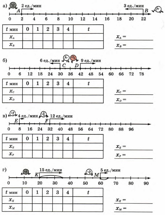 2. Игра “Движущиеся точки”. Изобрази одновременное движение точек по координатному лучу в течение первых 4 минут после выхода. Опиши, что ты наблюдаешь?