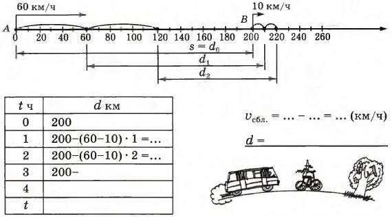 Часть 2. Урок 28 Движение вдогонку1. а) Из пунктов А и В, удаленных друг от друга на 200 км, одновременно в одном направлении выехали автобус и велосипедист. Скорость велосипедиста 10 км/ч, а автобус догоняет его со скоростью 60 км/ч. Как изменяется расстояние между ними за 1 час? Чему оно будет равно через 1 ч, 2 ч, 3 ч, t ч? Когда произойдет встреча? Закончи построения на координатном луче и обозначь место встречи флажком. Заполни таблицу и запиши формулу зависимости расстояния d между автобусом и велосипедистом от времени движения t.