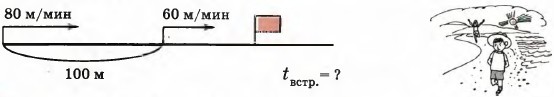 S — первоначальное расстояние; υ1 и υ2 — скорости объектов, движущихся вдогонку (υ1 > υ2); tвстр. — время до встречи. 2. Миша начал догонять Борю, когда расстояние между ними было 100 м. Миша идет со скоростью 80 м/мин, а Боря — со скоростью 60 м/мин. Через сколько времени Миша догонит Борю?