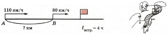 3. Из пунктов А и В одновременно в одном направлении выехали 2 поезда. Скорость первого поезда равна 80 км/ч, а скорость второго поезда, идущего вдогонку первому поезду, равна 110 км/ч. Встреча произошла через 4 ч после выезда поездов. На каком расстоянии друг от друга находятся пункты А и В?
