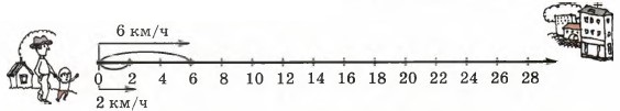 Часть 2. Урок 29 Движение с отставанием1. Мальчик и мужчина вышли из одной и той же деревни в одно и то же время и пошли в город по одной и той же дороге. Скорость мужчины 6 км/ч, а скорость мальчика 2 км/ч. Изобрази их движение на координатном луче и найди расстояние между ними через 4 ч после начала движения.