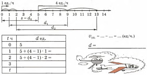 Как найти это расстояние с помощью вычислений, не выполняя построения? 2. Из точки А(0) координатного луча вылетел вертолет со скоростью 1 ед./ч. Одновременно из точки В (5) в том же направлении вылетел самолет со скоростью 4 ед./ч. Как изменяется расстояние между ними за 1 ч? Чему оно будет равно через 1 ч, 2 ч, 3 ч? Сможет ли вертолет догнать самолет? Почему? Продолжи построение на луче и заполни таблицу. Запиши формулу зависимости расстояния d между вертолетом и самолетом от времени движения t.