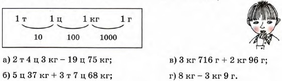 8. В 8 часов расстояние между 2 катерами, плывущими навстречу друг другу, было 250 км. Скорости катеров 25 км/ч и 35 км/ч. Встретятся ли они до 12 часов того же дня? Через сколько времени произойдет встреча? (Ответ вырази сначала в часах, а затем в часах и минутах.) 9. Запиши выражения: а) произведение числа а и суммы b и с; б) частное разности чисел x и d и произведения чисел у и n; в) сумма частного чисел k и m и разности чисел а и b. 10. Пользуясь таблицей мер массы, выполни действия: