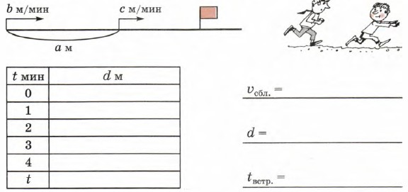 Часть 2 Формула одновременного движения. Урок 321. От деревни Смолино до Алексеевки 10 км. Из Алексеевки в направлении Смолино выехала повозка со скоростью 8 км/ч. Она догоняет пешехода, который вышел из Смолино одновременно с повозкой со скоростью 3 км/ч и в том же направлении, что и повозка. Как и с какой скоростью изменяется расстояние между ними? Через сколько часов произойдет встреча? Нарисуй схему движения (1 см — 2 км). 2. Вадим догоняет Сережу. Сейчас между ними а м. Вадим бежит со скоростью b м/мин, а Сережа — со скоростью С м/мин (b > c). Как и с какой скоростью меняется расстояние между мальчиками? На каком расстоянии друг от друга окажутся они через 1 мин, 2 мин, 3 мин, 4 мин, t мин? Через сколько минут Вадим догонит Сережу?