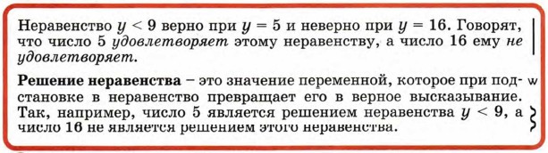 1. Найди в тексте, выделенном рамкой: а) вводную часть; б) главную мысль; в) пример, иллюстрирующий эту главную мысль. Какими символами обозначены эти части текста? Придумай свои примеры неравенств и их решений и сделай конспект. Как ты думаешь, что понимается в тексте под термином “решение неравенства” — действие или число? 2. Какие из чисел 24, 91, 318, 56, 7 удовлетворяют неравенству t > 56, а какие ему не удовлетворяют? Почему? 3. Какие из чисел 75, 71, 70, 65, 9, 0 являются решениями неравенства 75 - x > 4? Докажи.