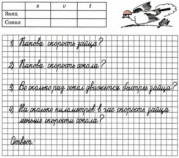 8. Заяц за 2 ч пробегает 14 км, а сокол за 3 ч пролетает 210 км. Во сколько раз сокол движется быстрее зайца? На сколько километров в час скорость зайца меньше скорости сокола?