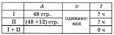 10. а) Закончи заполнение таблицы и реши задачу: Машинистка в первый день напечатала 48 страниц рукописи, а во второй день — на 12 страниц больше, чем в первый. На всю работу в эти 2 дня она затратила 9 часов. Сколько часов работала она в каждый из этих дней, если производительность ее не менялась?