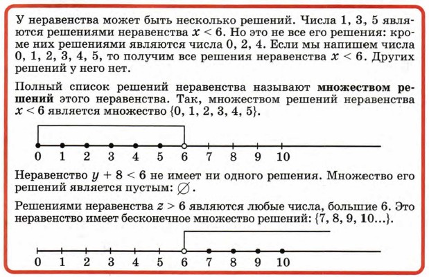 1. Найди в тексте, выделенном, рамкой вводную часть, главную мысль, примеры. Обозначь эти части текста знаками соответственно 2. Запиши множество решений неравенства и отметь его на числовом луче. Существует ли в этом множестве наименьший элемент?