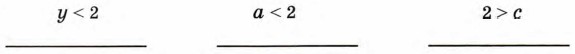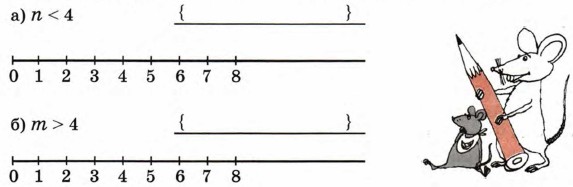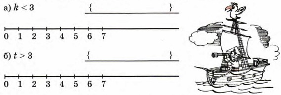 5. Какое из множеств {0, 1, 2, 3}, {0, 1, 2}, {1, 2, 3}, {3, 4, 5 ...}, {4, 5, 6 ...}, ∅ служит множеством решений неравенства x < 3? 6. При решении неравенства получили ответ: а) {0, 1, 2, 3, 4, 5, 6}; б) {5, 6, 7 ...}. Какое неравенство решали? 7. А, В и С — множества решений трех неравенств. Напиши эти неравенства, если: А = {0, 1, 2, 3, 4, 5, 6, 7, 8}, В = {0, 1, 2, 3, 4}, С = {2, 3, 4 ...}.